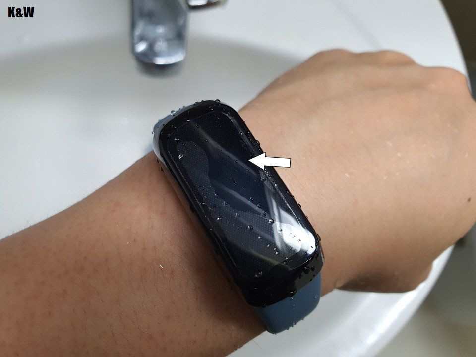 갤럭시핏은 5ATM(기압)방수를 제공하고 있어서 손을 씻을 때나 수영할 때 등 물로부터 보호해주는 편리함이 있어요.