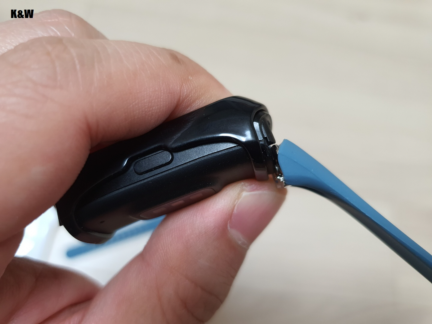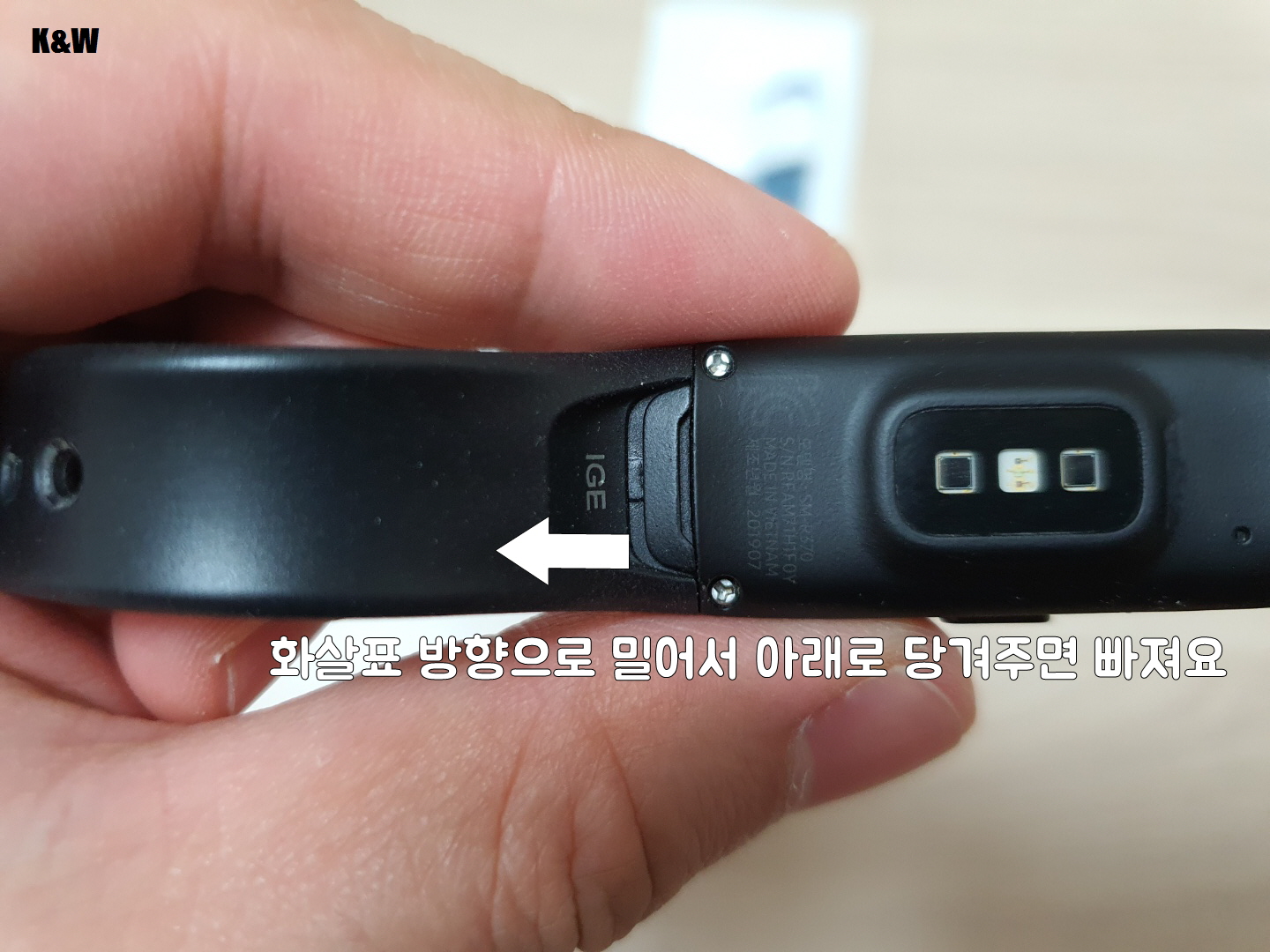 새로 구매한 스트랩을 적절히 위치시키고 위쪽방향으로 밀어주면