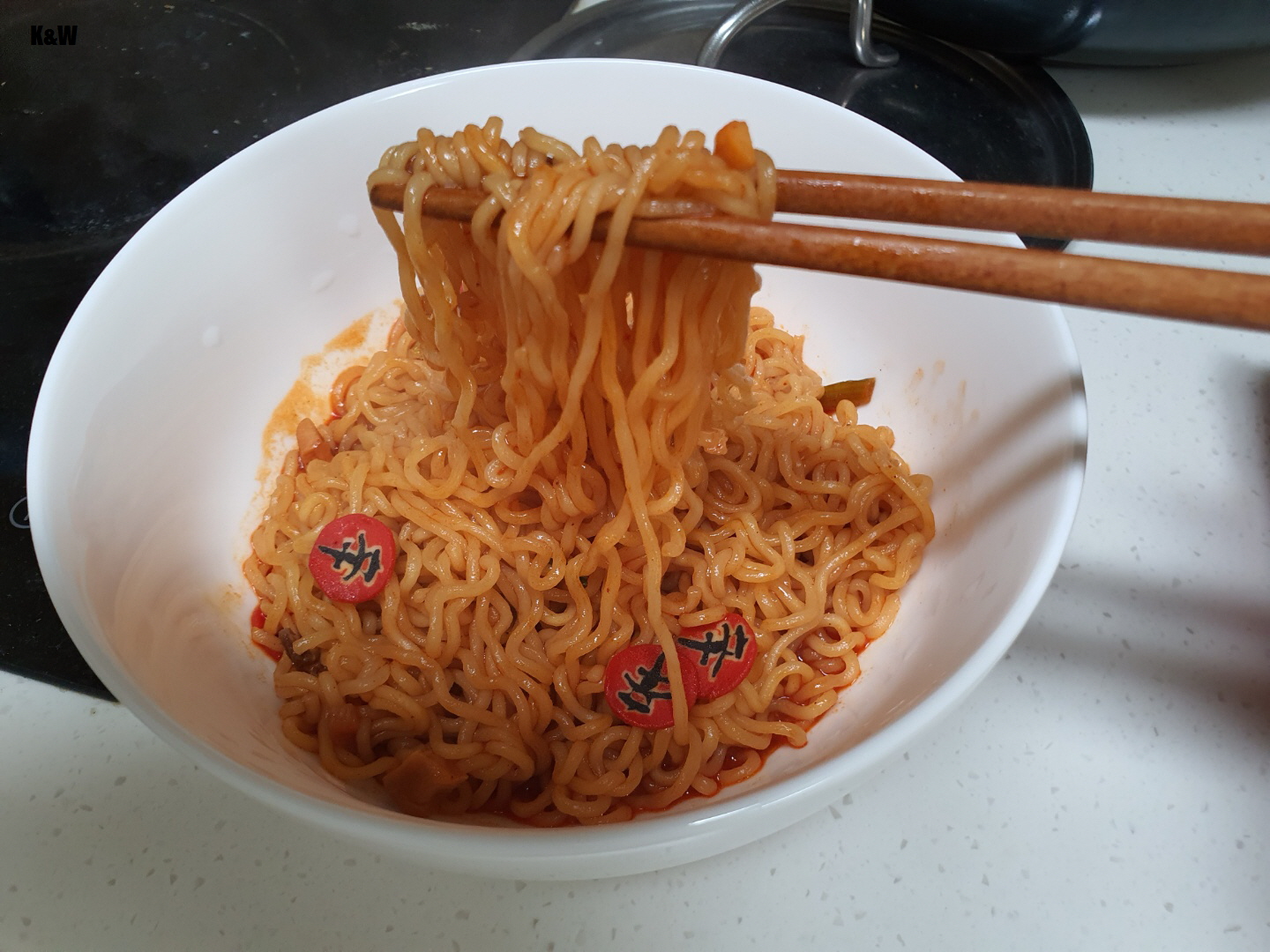 생김새는 불닭볶음면과 비슷하지만 맵기는 신라면과 비슷한 수준이었습니다.