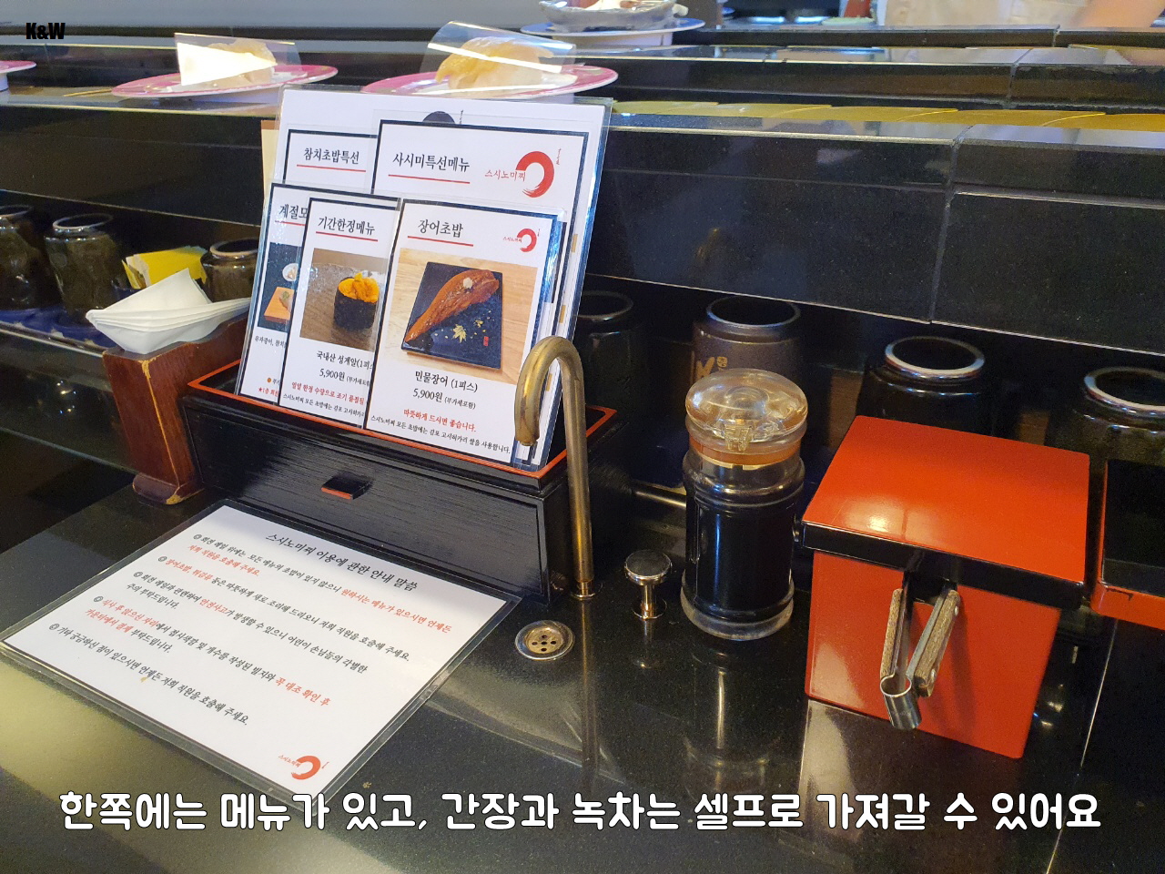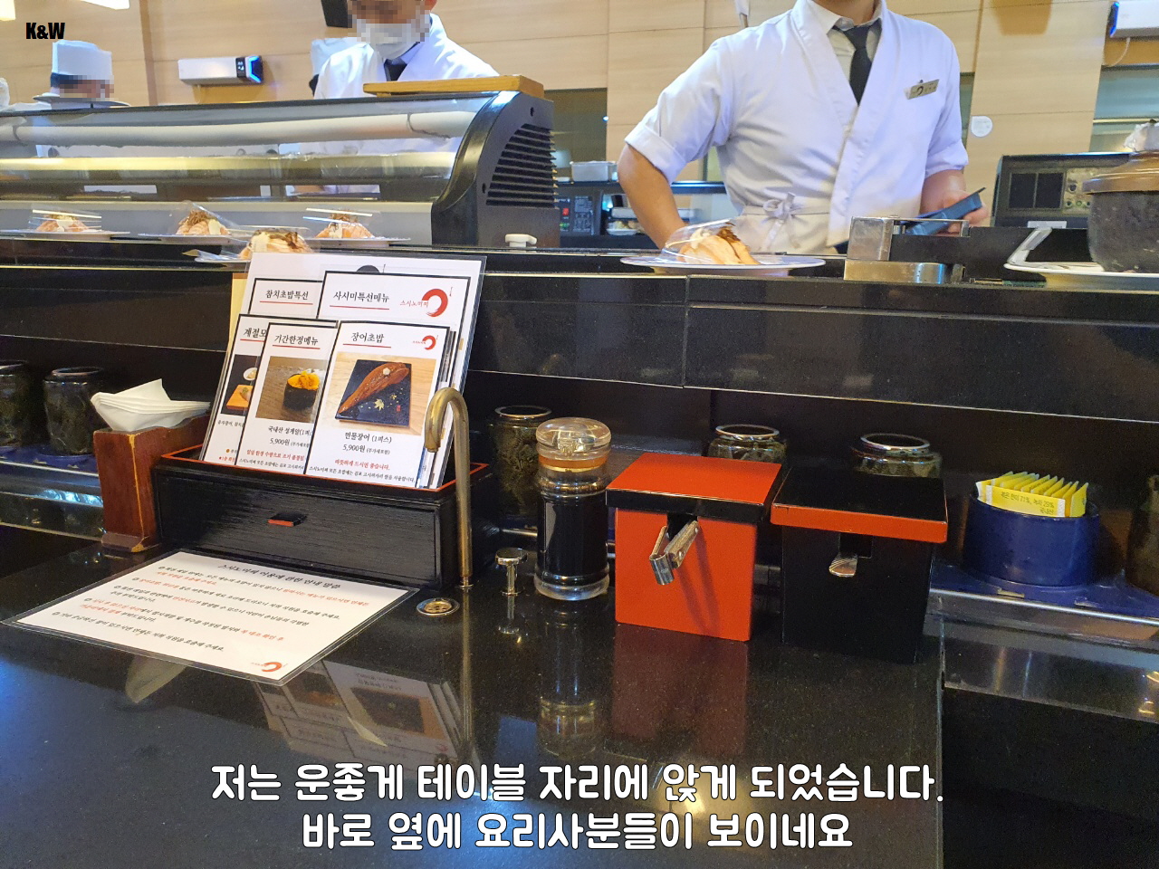 - 가격 : 검색해보면 접시 색깔별로 가격이 나와있으나 회전하는 곳에 종류가 다양하지 않고 대부분 직접 시켜먹음. 광어초밥 4,400원(2개) / 연어초밥 4,400원(2개) / 장어초밥 5,900원(1개)