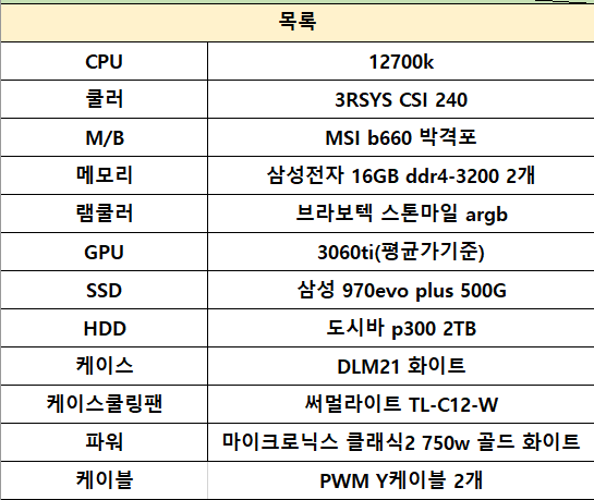 긴 시간 작업용으로 적합한 가성비 수냉쿨러와 적절한 그래픽 작업을 받쳐줄 3060ti로 조립했어요!