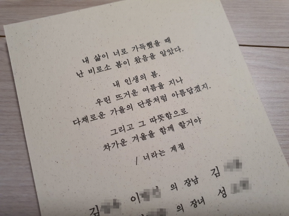 우리 부부는 받는사람이 기억하길 바라는 마음으로 청첩장을 고르기 시작했다.