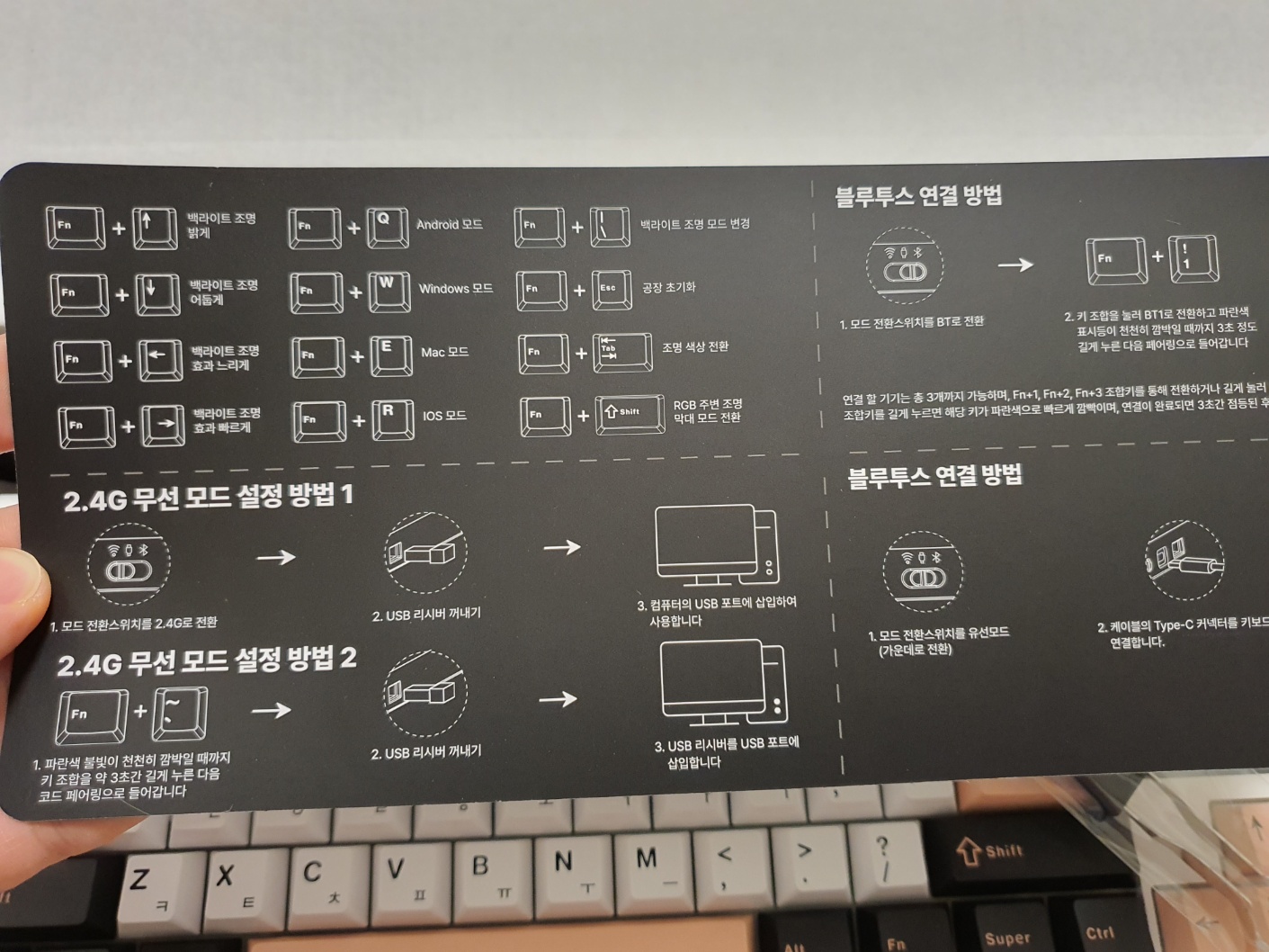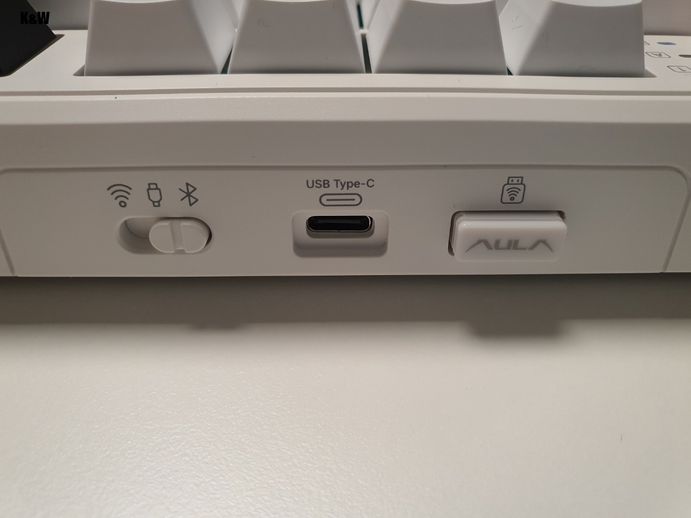 키보드 앞쪽에는 블루투스, 유선연결, 2.4무선연결 3가지 모드를 조절할 수 있고