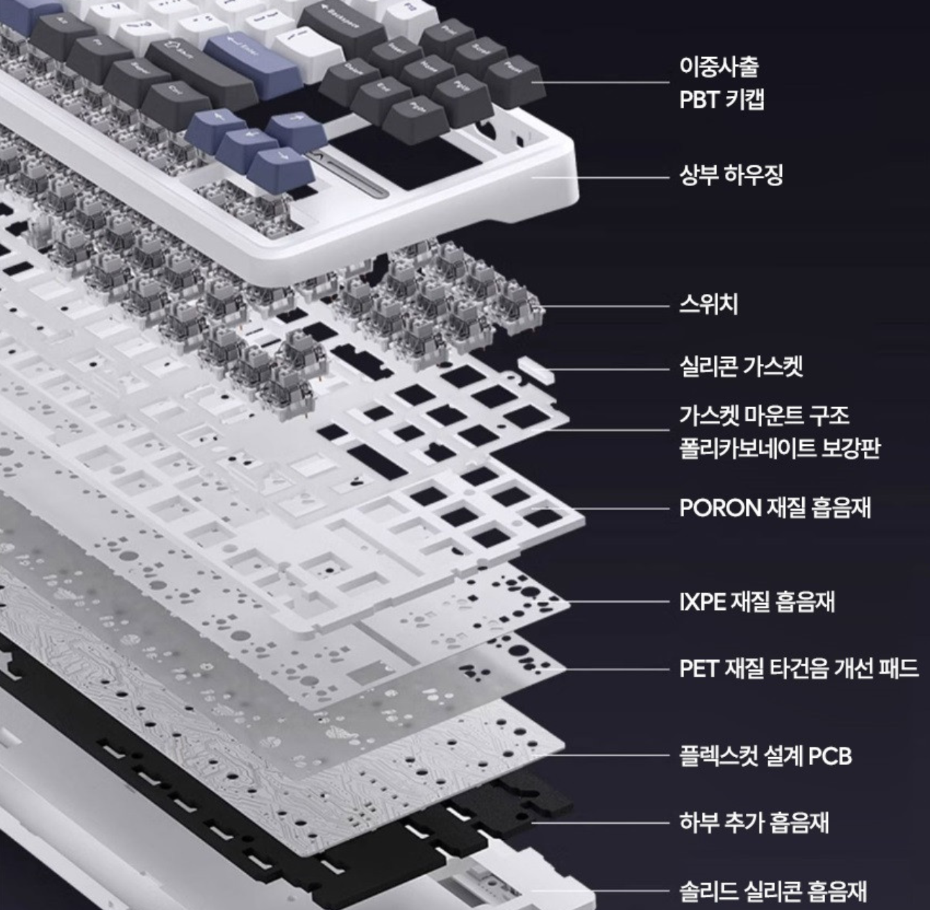 인기가 많았던 이유는 키보드 내부에 이렇게 많은 흡음재와 패드들이 들어갔기 때문인데,