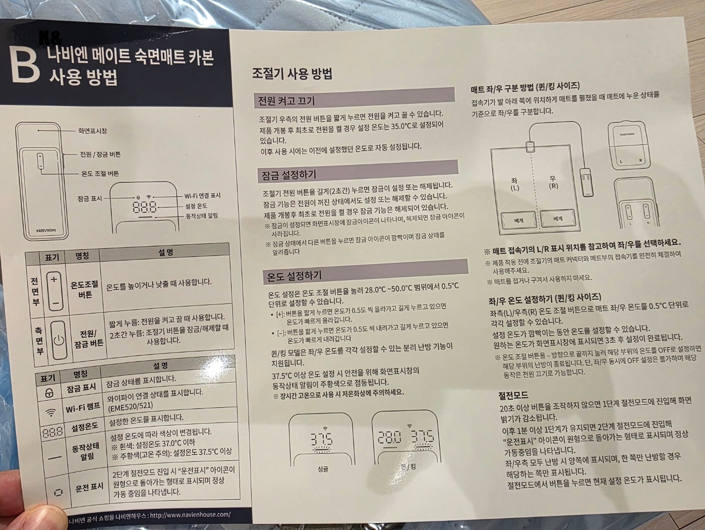 전기장판에 비해 열이 약함 전자파가 미세하게 있음(나비엔제품은 완전차단) |