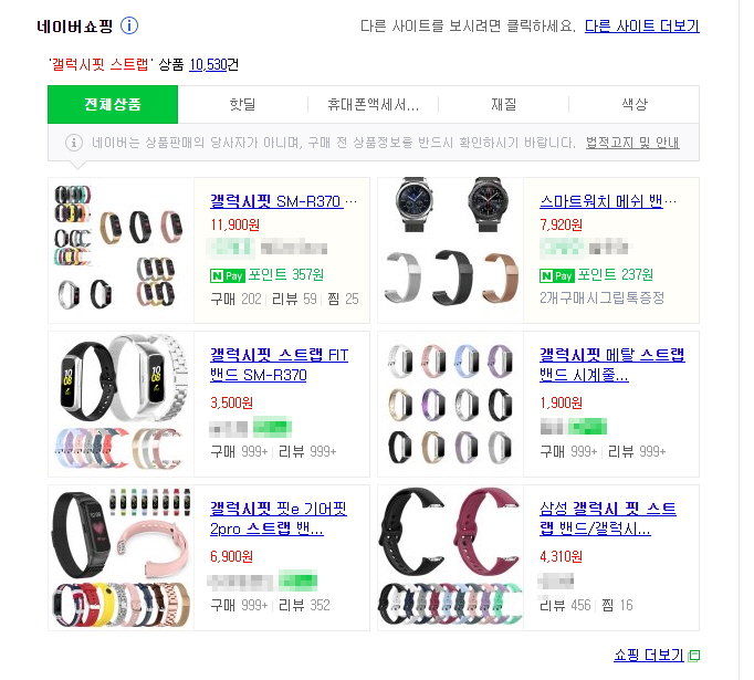 검색어를 '갤럭시 핏 스트랩'으로 지정하고 서칭을 했을 때 몇가지 판매 스토어와 사이트가 추려졌습니다.
