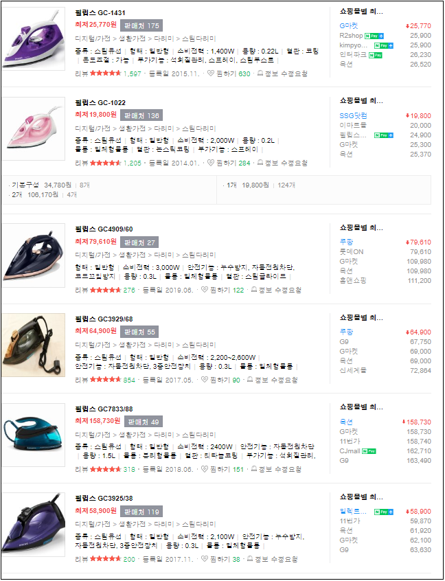 스크롤을 한참 내리다 보면 처음 등장하는 일반형 다리미는 필립스의 제품이었습니다.