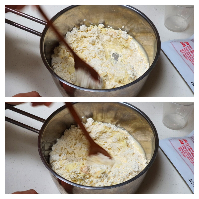 물, 반죽믹스, 이스트를 넣고 열심히 섞어줍니다.