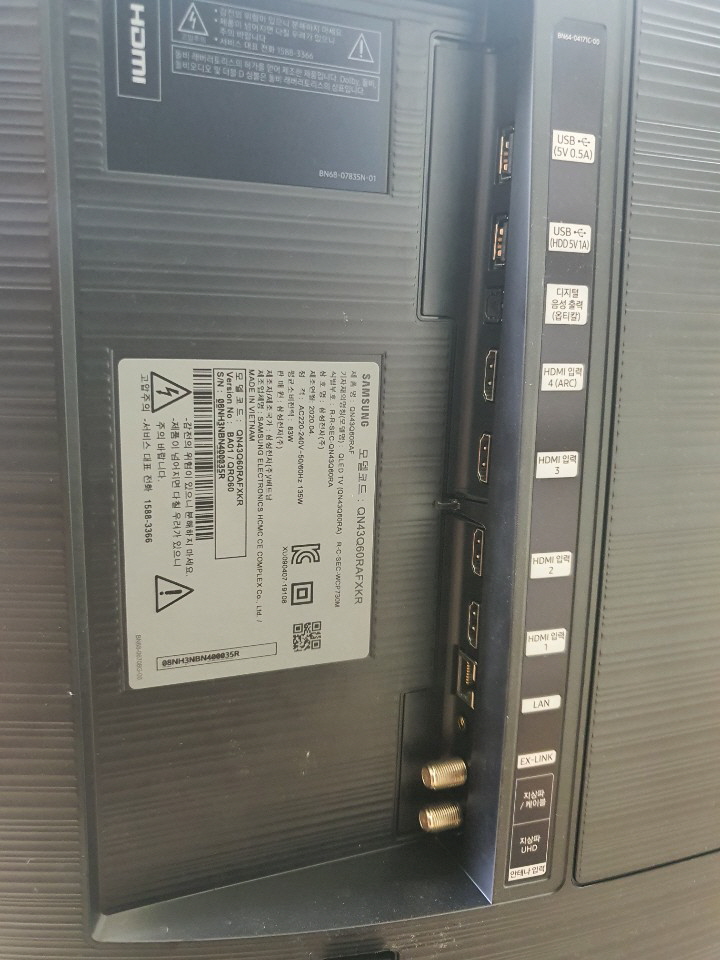 입력단자 부분은 HDMI, LAN, USB, ARC가 있습니다. 참고로 스마트 TV이기 때문에 Wifi도 가능합니다.
