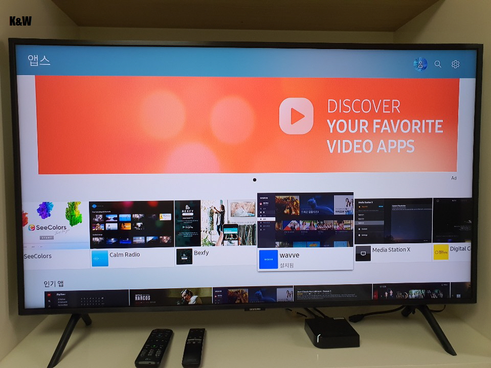 스마트TV 답게 다양한 앱 설치가 가능합니다. Wifi나 랜선 연결을 통해 연결만 되어 있다면 내가 원하는 앱들을 쏙쏙 담아둘 수 있죠. 저는 가족들이 WAVVE를 쓰고 있어서 이곳에 앱을 설치해두고 다시보기가 필요할 때마다 쓰고 있습니다.