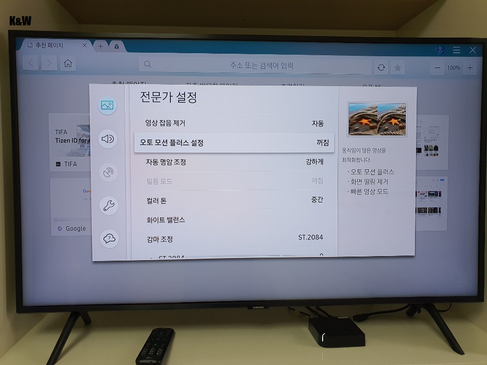 처음 구매 후 화면을 보면 눈에 거슬리는게, 약간 잔상이 남게 보이는 부분이 있습니다. 이러한 부분은 화면설정에서 오토 모션 플러스가 켜져있기 때문입니다. 화면 떨림을 제거한다거나 빠른영상에 적합하다고 하는쓰여있지만 다른 사람들도 이상하다는 평이 많았고 저도 불편해서 꺼놓았습니다.