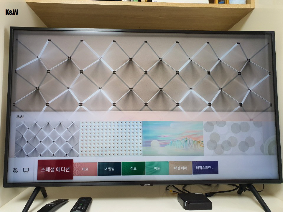 미국 타임지가 선정한 올해의 발명품에 선정된 삼성의 매직스크린기능. 비록 저는 스탠드형이라 많은 역할은 못하고 있지만 벽걸이TV 일때 빛을 발하는 기능인 것 같습니다. 삼성의 플래그쉽 QLED모델이라서 역시 해당 기능이 포함되어 있습니다.